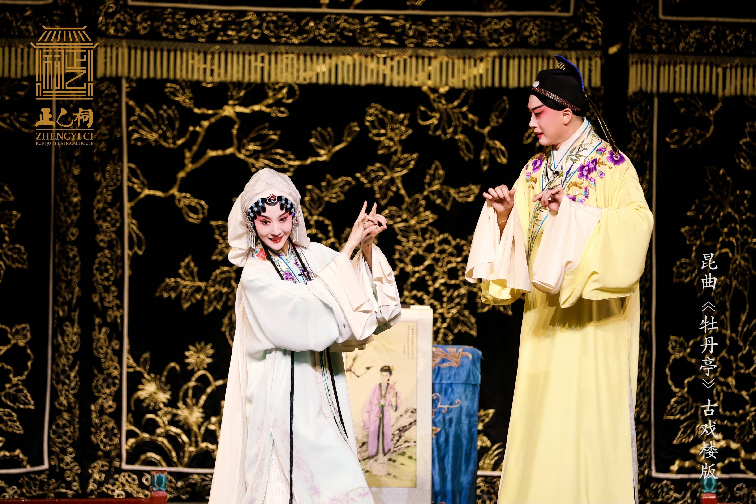 丽娘思春,悠然入梦。梦见与一秀才相会在牡丹亭前。群花翩翩起舞,赞美这对纯真挚诚的青年情投意合。