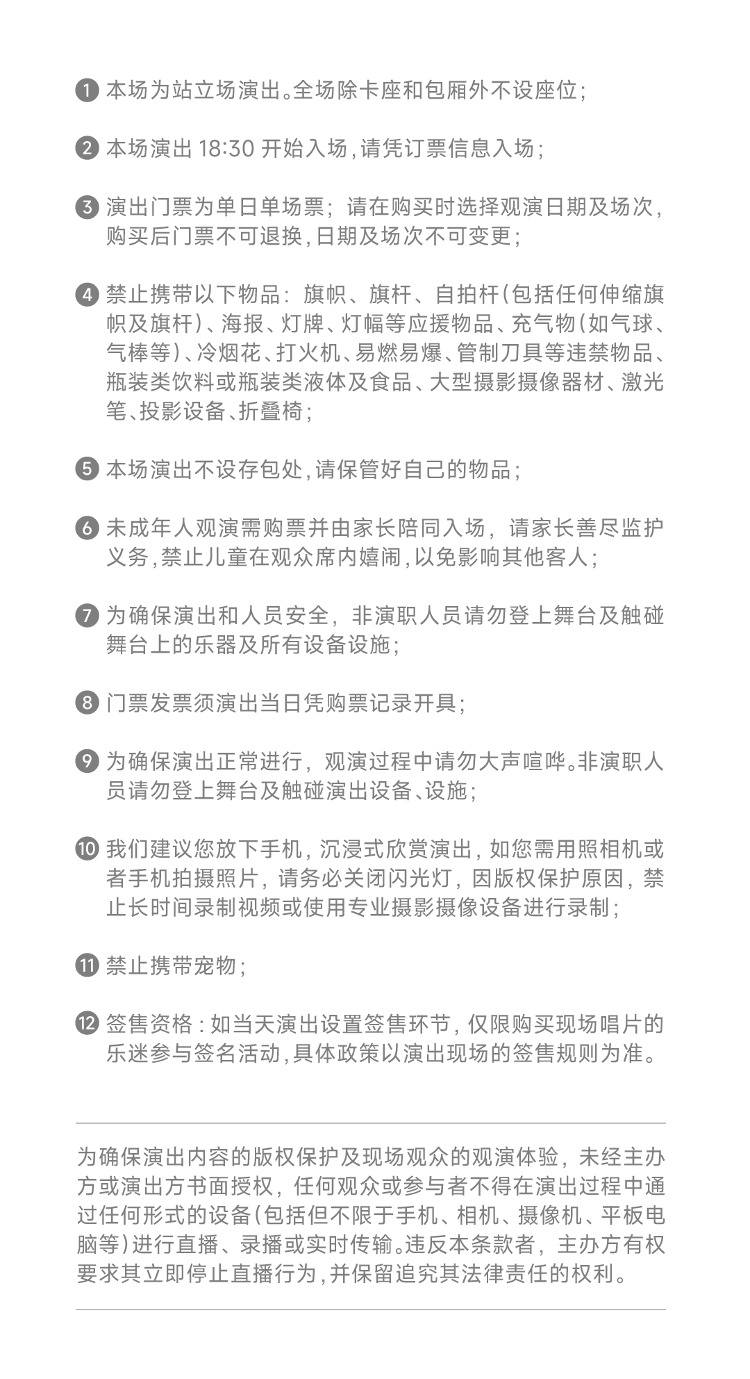 3.商品预售期间,票价调整及最终销售数量将由主办方和演出场馆确定,正式开票后将根据用户付款的先后顺序依次配票。我们会尽量满足用户需求,如最终未能配票,购票通承诺全额退款,敬请谅解。